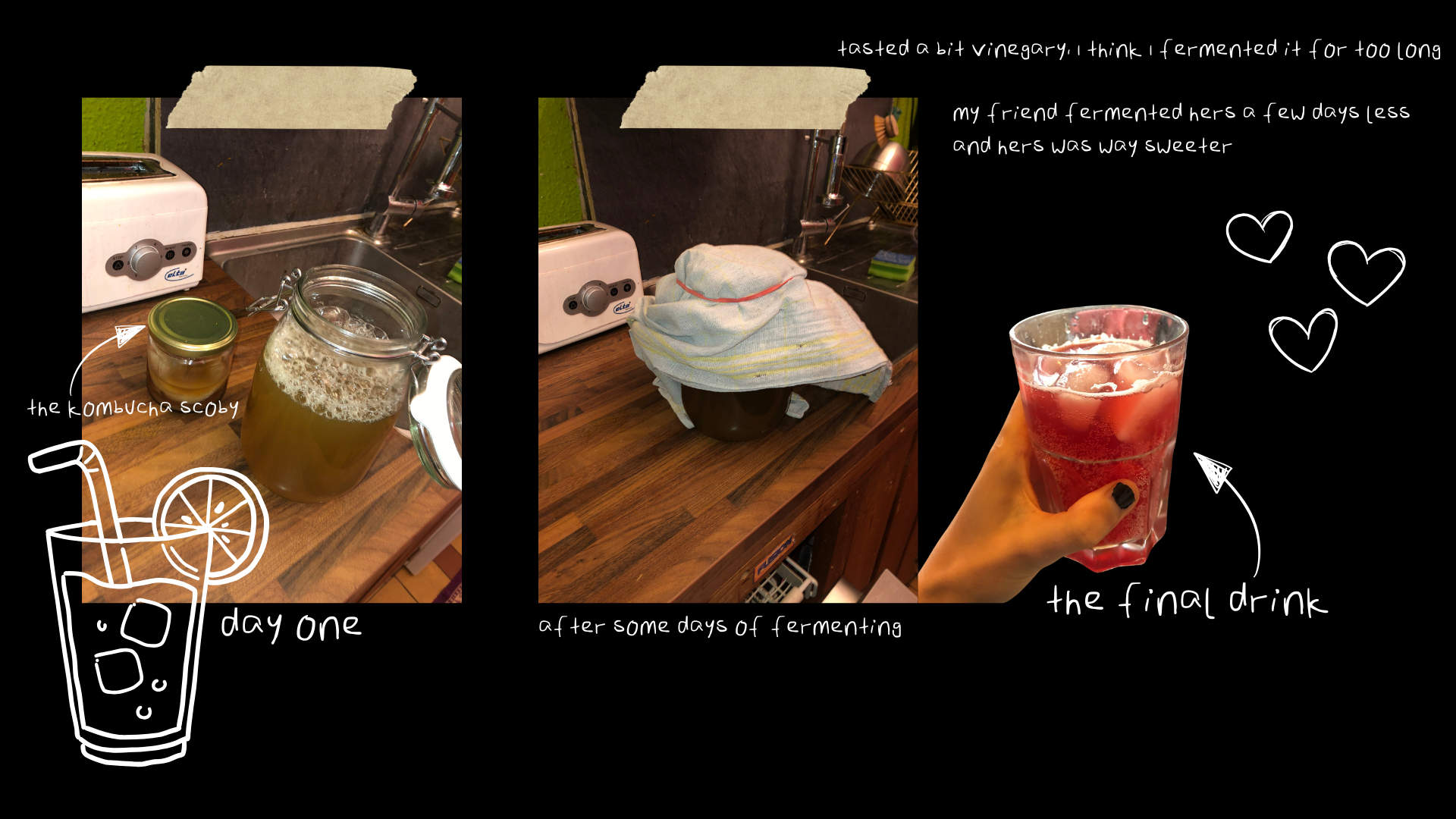Since the store bought one is kinda expensive, I fell down a rabbit hole of watching many many videos on how to brew Kombucha at home, and all the science behind it. I got said friend who introduced me to Kombucha equally obsessed about the idea of brewing Kombucha at home, so we started this little project at home, giving each other updates on the brewing and fermenting process over the phone due to our long-distance friendship. The whole process took over two weeks since the drink had to ferment for 10-14 days. The whole project was lots of fun, it was a lot of try and error, and since I“ll continue brewing Kombucha, I think there will be lots of room for improvement, and I“m curious to see how my second batch of Kombucha will turn out.